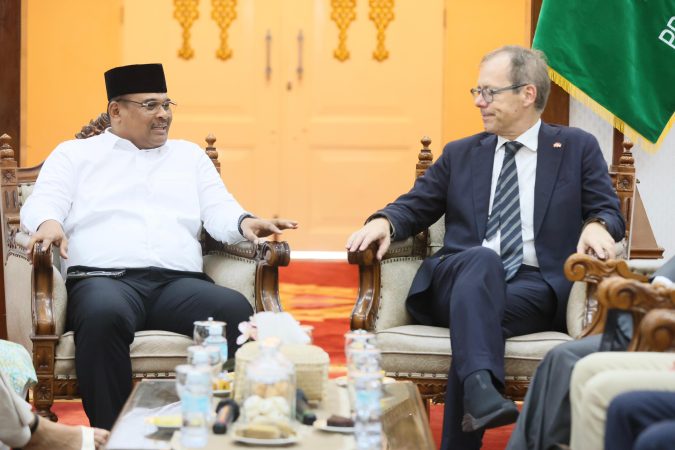 Banda Aceh — Penjabat Gubernur Aceh, Dr. H. Safrizal ZA, M.Si., menyambut kedatangan Duta Besar Swiss untuk Indonesia, H.E. Mr. Olivier Zehnder, di Meuligoe Gubernur Aceh pada Senin, 14 Oktober 2024. Dubes Zehnder tiba bersama rombongan yang terdiri dari Ms. Violette Ruppanner, Kepala SECO Indonesia; Mr. Jonas Grunder, Manajer Program SECO, Bern; Mr. Nikolaus Gyamfi, Pengacara SECO, Bern; serta Mr. Muhammad Halil Rahim, National Project Officer SECO Indonesia.